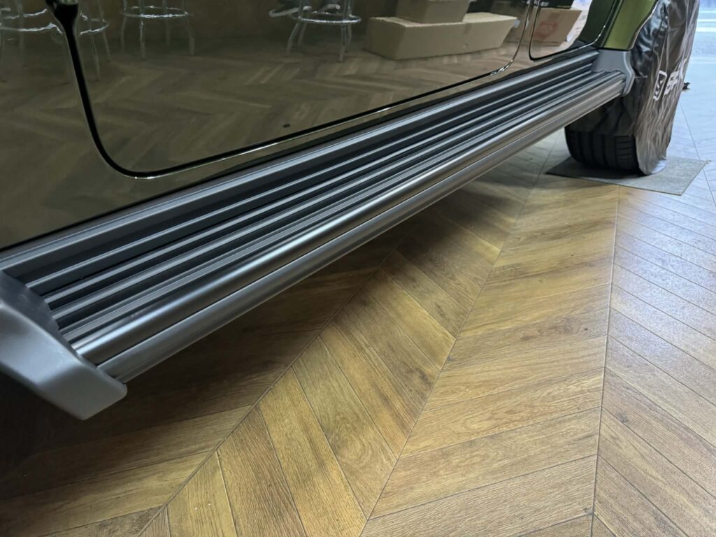 乗り降りの際に必ず目に入るサイドステップ。 ここもシルバーからサテンブラックへ。面積が大きく、かつ乗り降りで視線がいくポイントなので、ここを変えるだけでクルマ全体の重心が低く見え、どっしりとした安定感が生まれます。