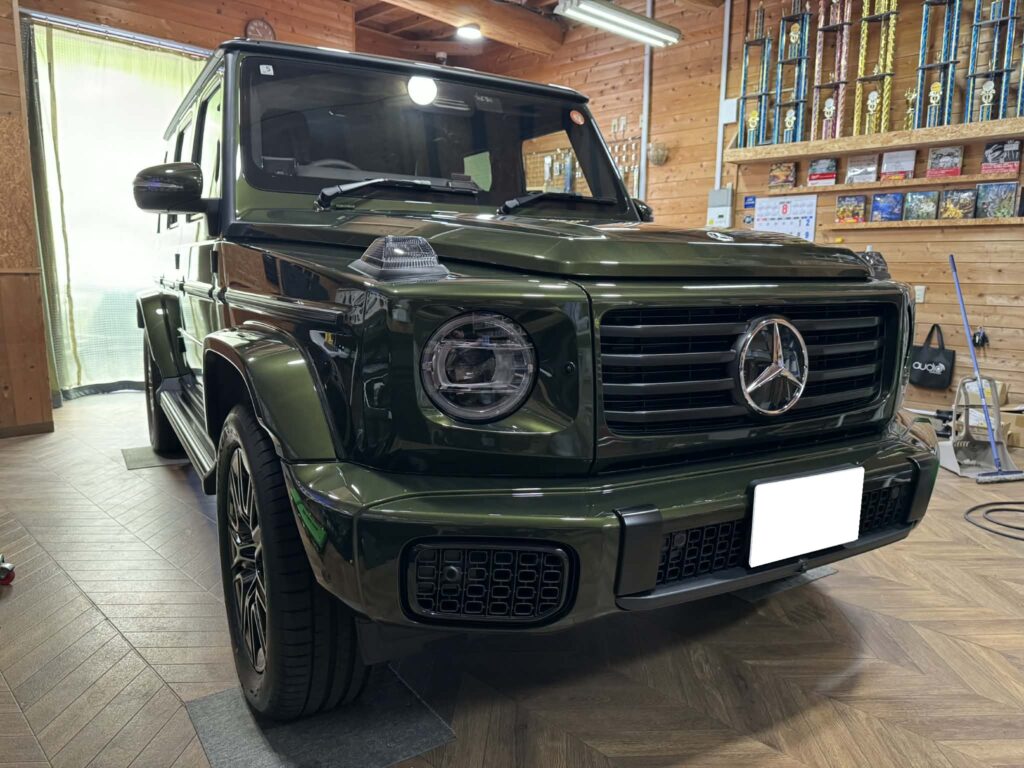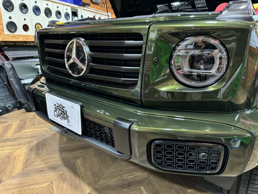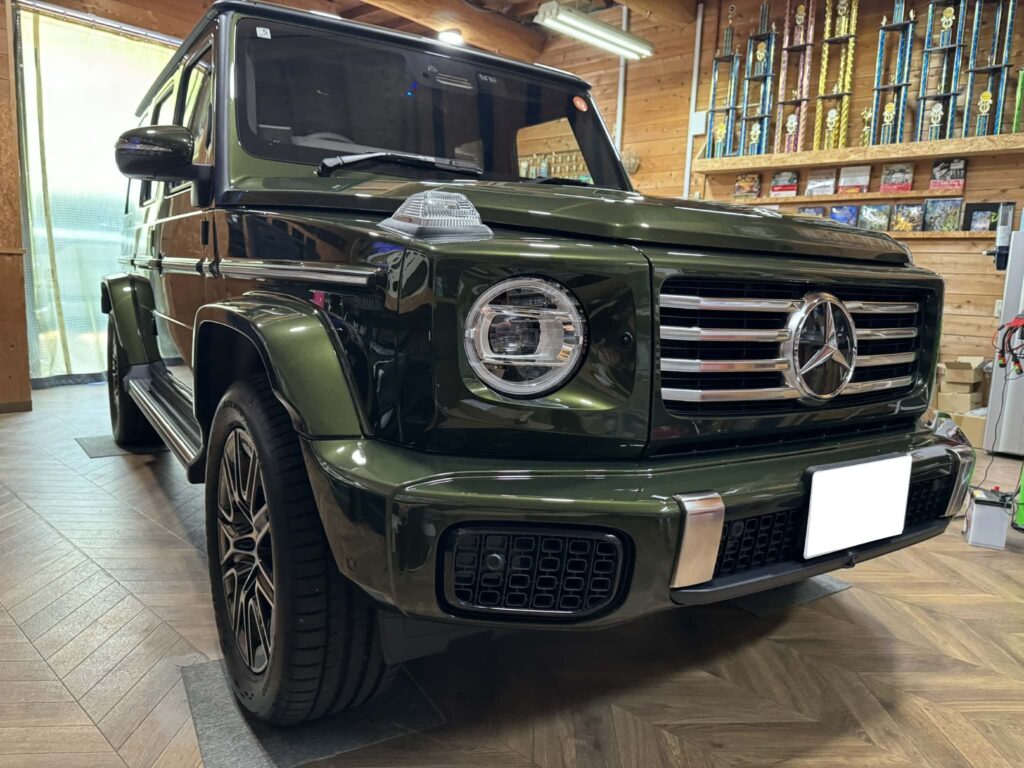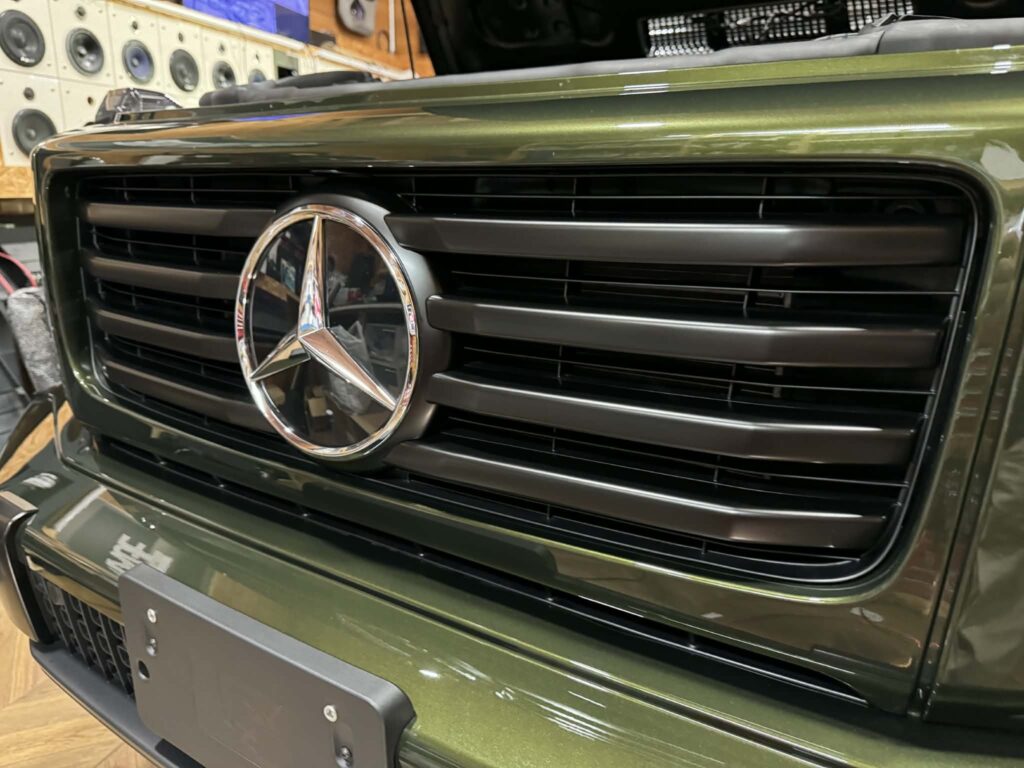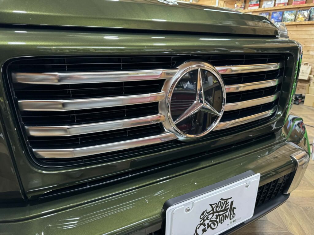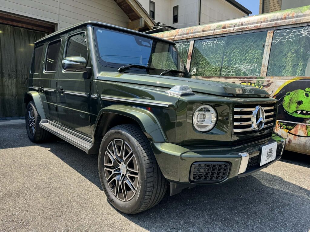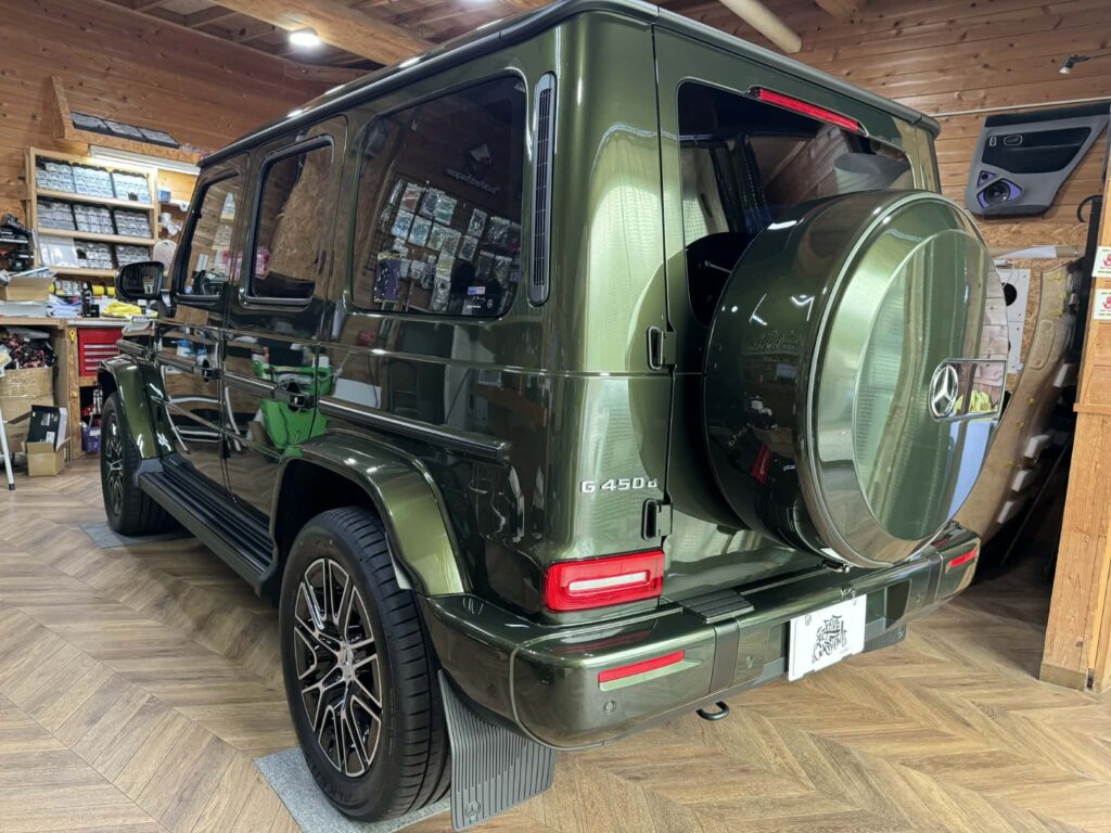 今回ご紹介するのはメルセデス・ベンツ G450dのご紹介です。 ボディカラーは深みのある渋いグリーン。このままでも十分に素敵な一台ですが、オーナー様のこだわりで「各部のクロームパーツをナイトパッケージ仕様に…」とのご相談をいただきました。ありがとうございます。