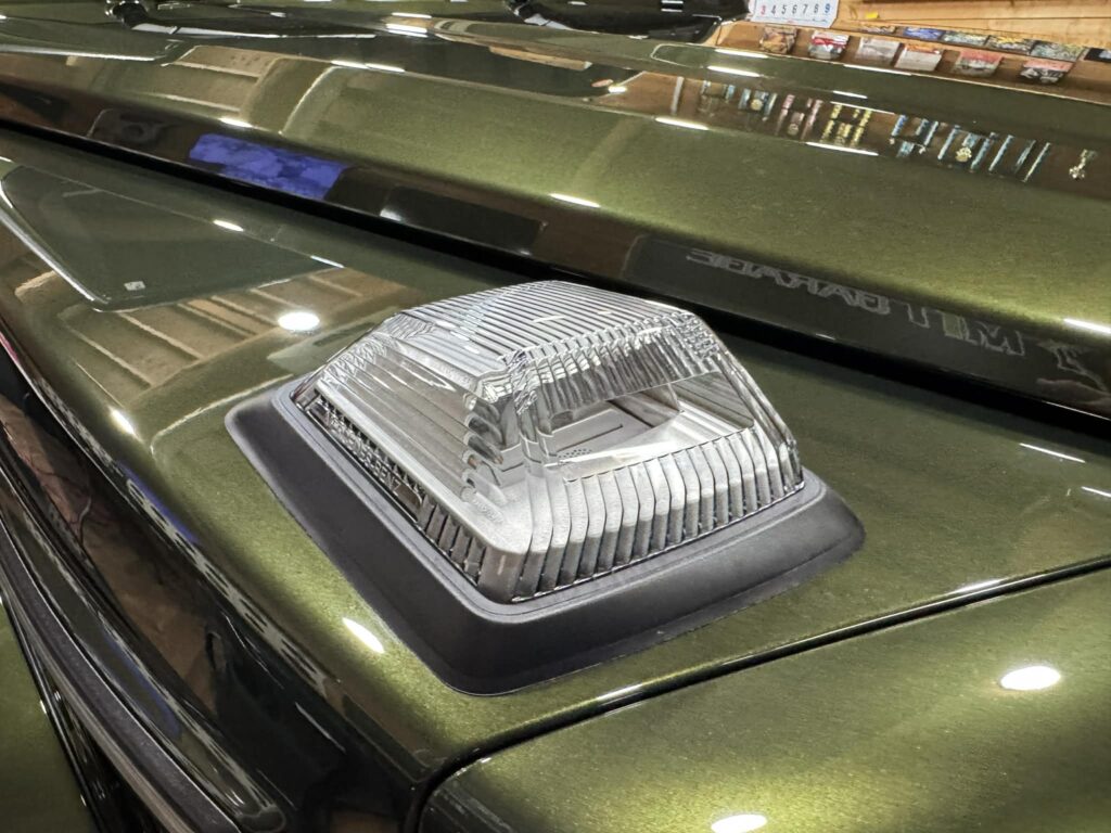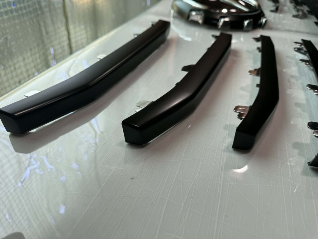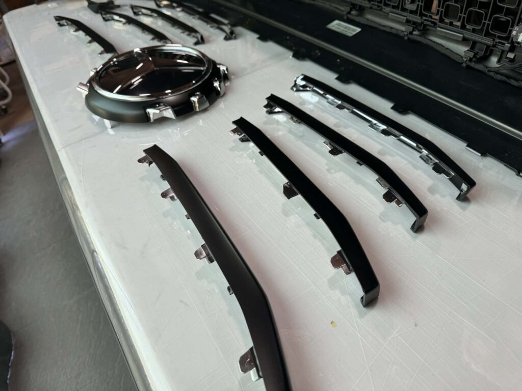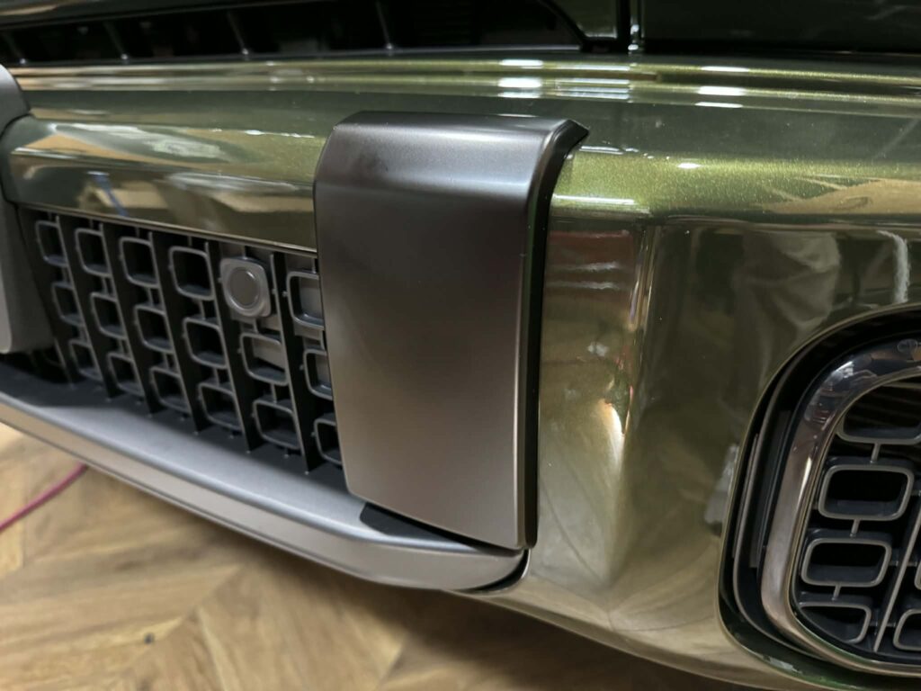 まずは顔の印象を決めるフロントグリルから。 面積の広いメッキ部分をサテンブラックでラッピングしました。グロス(艶あり)ではなくサテンを選ぶことで、グリーンのボディカラーと喧嘩せず、しっとりと馴染む重厚なフロントフェイスに仕上がります。