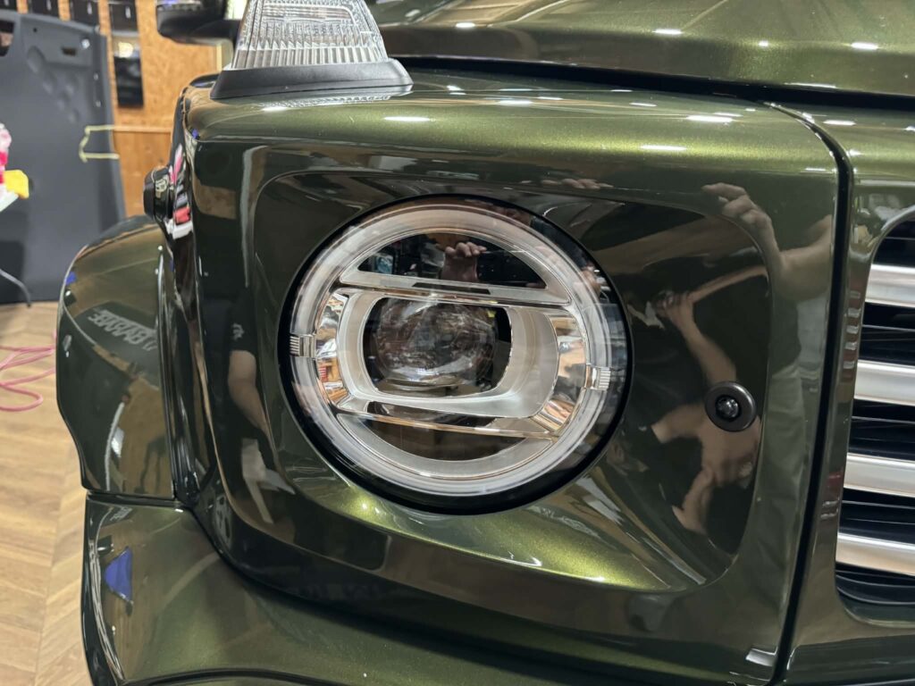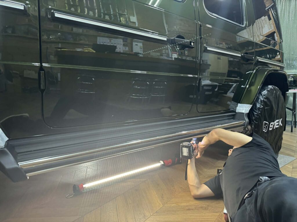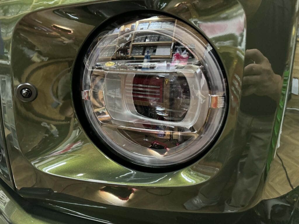 使用するのは、絶妙な半艶が美しい3Mサテンブラック。 テカテカしすぎず、マットすぎないこの質感が、Gクラスの風格をさらに引き立てます。