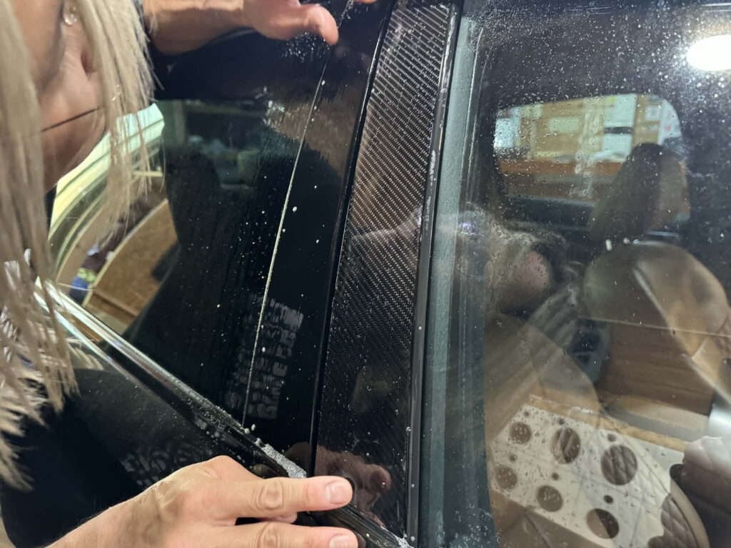 傷が目立ちやすいピアノブラックのピラーも、同じくSTEKのカーボンフィルムでガードしていきます。