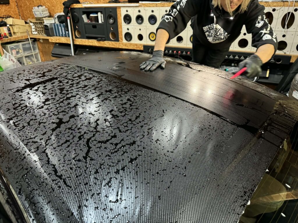 大判のフィルムをシワなく、かつカーボンの柄が歪まないように慎重に貼り進めていきます。