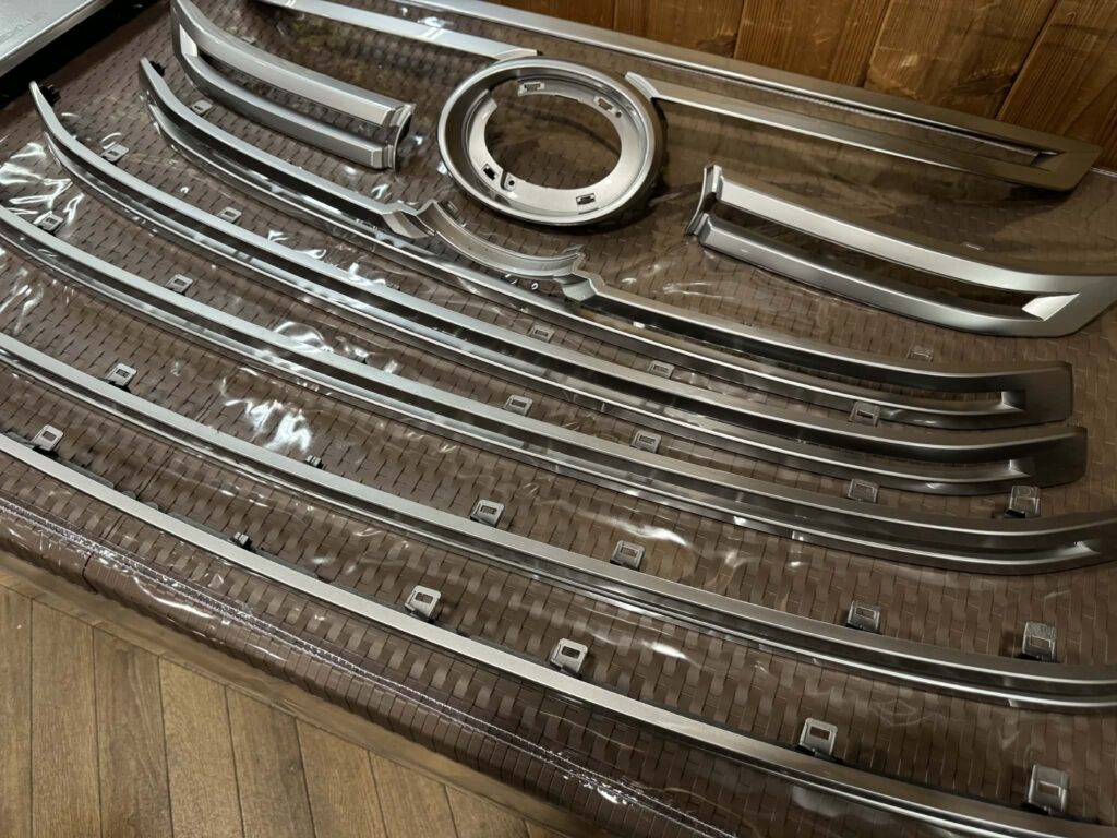 LX600のフロントマスクにおいて、唯一といってもいい「差し色」が、巨大なラジエーターグリルのシルバー部分。ここをボディのアクセントカラーに合わせてピアノブラックでペイントします。