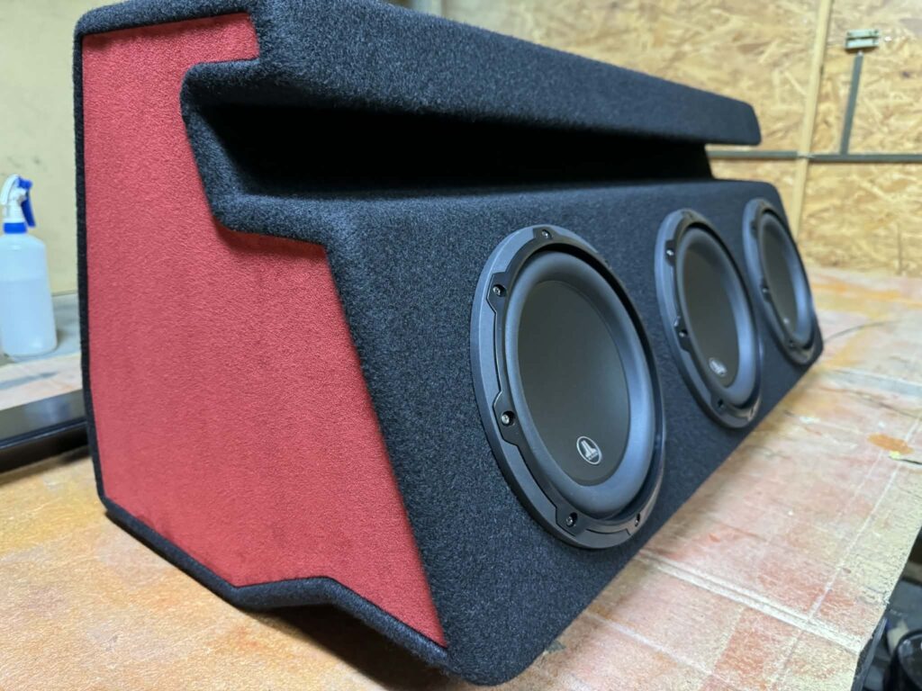 完成したボックスに生地を貼り込み、トランクへインストール。 機能美溢れるタワーバーと、職人技の詰まったウーファーボックスが共存する、非常にレーシーかつラグジュアリーな空間が完成しました。