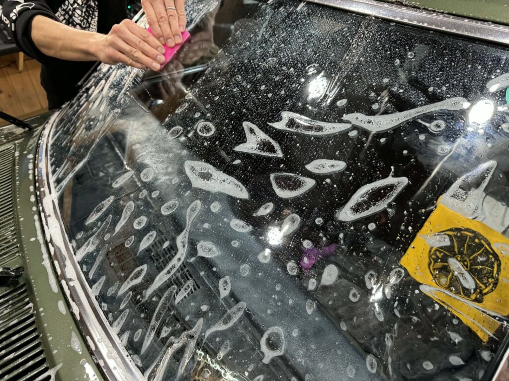施工後は、フィルム専用のコーティングを施します。これにより撥水性が高まり、汚れの付着を防ぐとともに、フィルム自体の寿命もさらに延ばすことができます。