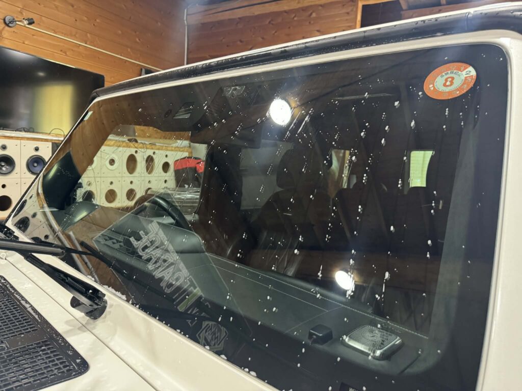 これ、Gクラス特有の「垂直に近いフロントガラス」が原因なんです。傾斜があれば弾き飛ばせる石も、Gクラスだと真っ向から受け止めてしまう。 「もう二度とこの出費はしたくない…」と、ネットで対策を調べ上げ、山奥の当店までご相談に来られました。ありがとうございます!
